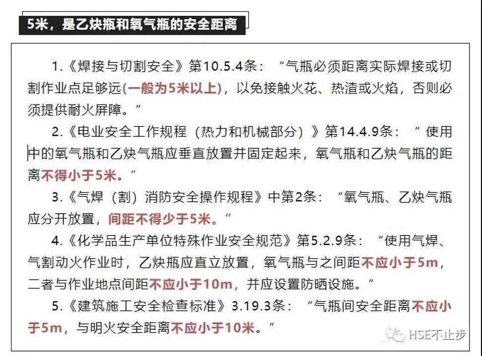 1. 使用乙炔氣瓶的現(xiàn)場,乙炔氣的存儲不得超過30m3(相當于5瓶,指公稱容積為40L的乙炔瓶),乙炔氣的儲存量超過30m3時,應用非燃燒材料隔離出單獨的儲存間,其中一面應為固定墻壁。 2. 乙炔氣的儲存量超過240m3(相當40瓶)時,應建造耐火等級不低于二級的存儲倉庫,與建筑物的防火間距不應小于10m,否則應以防火墻隔開。