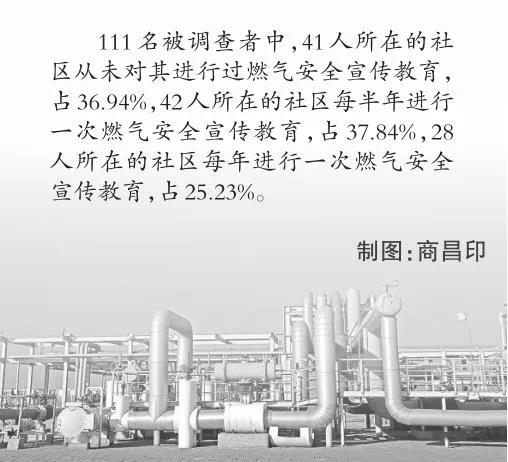 這一點(diǎn),從記者的問卷調(diào)查結(jié)果中也得到了印證。111名被調(diào)查者中,41人所在的社區(qū)從未進(jìn)行過燃?xì)獍踩麄鹘逃?,?6.94%,42人所在的社區(qū)每半年進(jìn)行一次燃?xì)獍踩麄鹘逃?,?7.84%,28人所在的社區(qū)每年進(jìn)行一次燃?xì)獍踩麄鹘逃?,?5.23%。