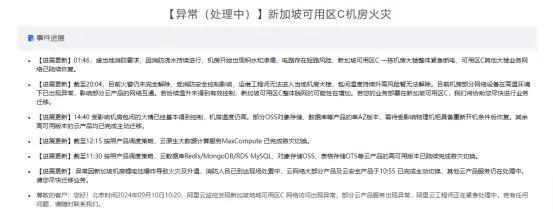 火災(zāi)公告顯示,11日凌晨01:46,接當(dāng)?shù)叵酪?,因消防澆水持續(xù)進(jìn)行,機(jī)房開(kāi)始出現(xiàn)積水和滲漏,電路存在短路風(fēng)險(xiǎn),新加坡可用區(qū)C一棟?rùn)C(jī)房大樓整體緊急斷電,可用區(qū)C其他大樓業(yè)務(wù)網(wǎng)絡(luò)已陸續(xù)恢復(fù)。